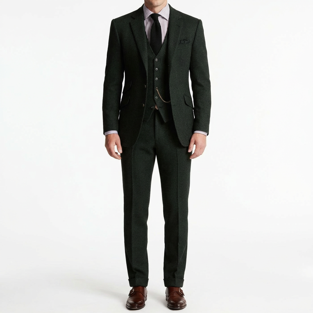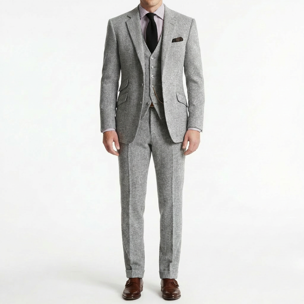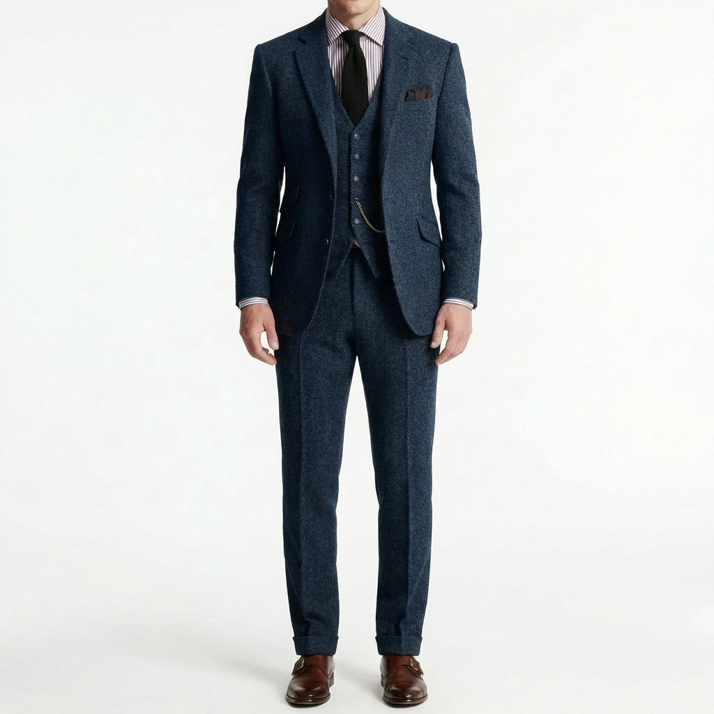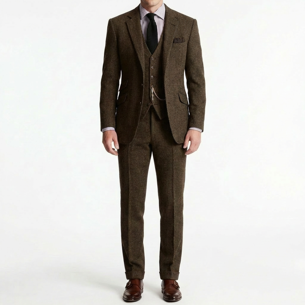 Proyecta distinción atemporal con un traje tres piezas que evoca la elegancia de los caballeros de antaño. Su chaleco con cadena decorativa añade un toque de refinamiento vintage que te distingue al instante, mientras que la solapa clásica enmarca el rostro con autoridad y sofisticación. El corte estructurado realza tu silueta con líneas impecables que transmiten confianza en cada movimiento. Perfecto para bodas de otoño, eventos formales o ocasiones especiales donde quieras dejar una impresión memorable de elegancia británica.