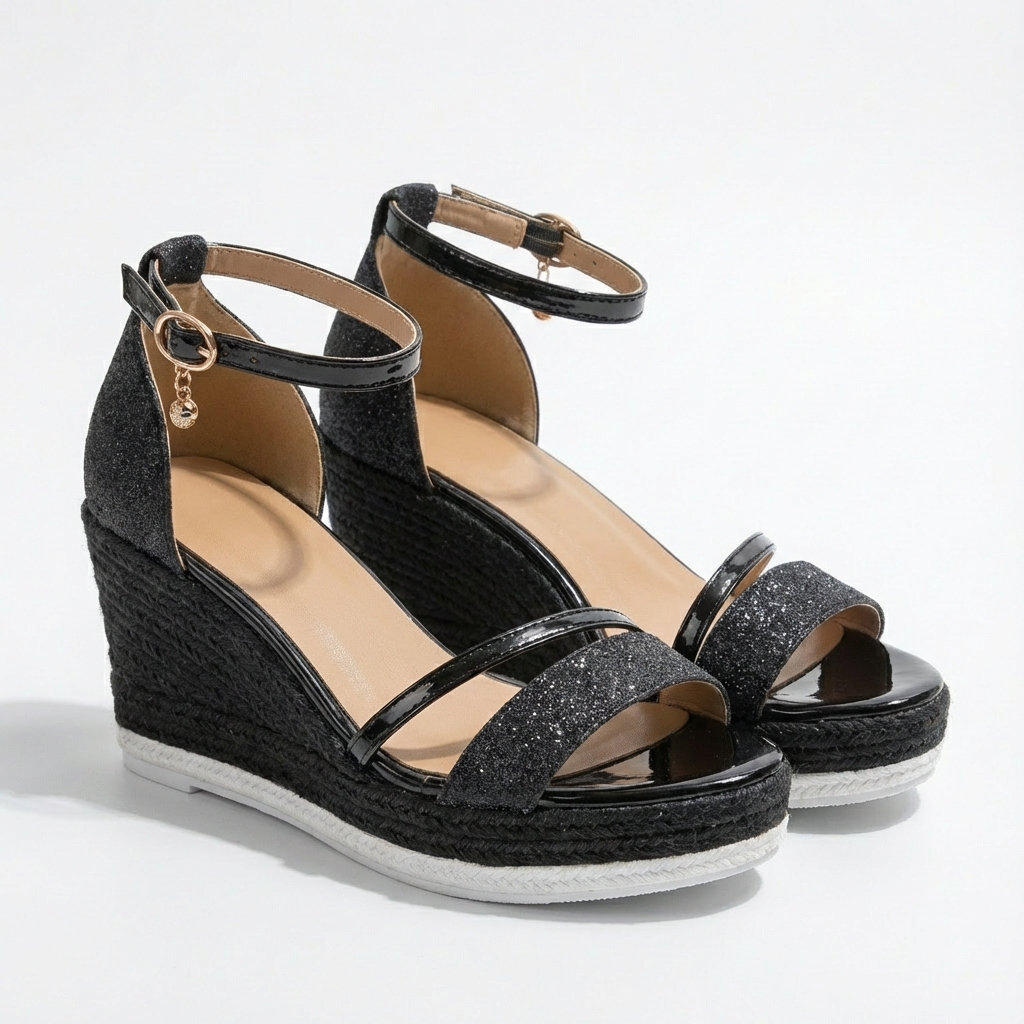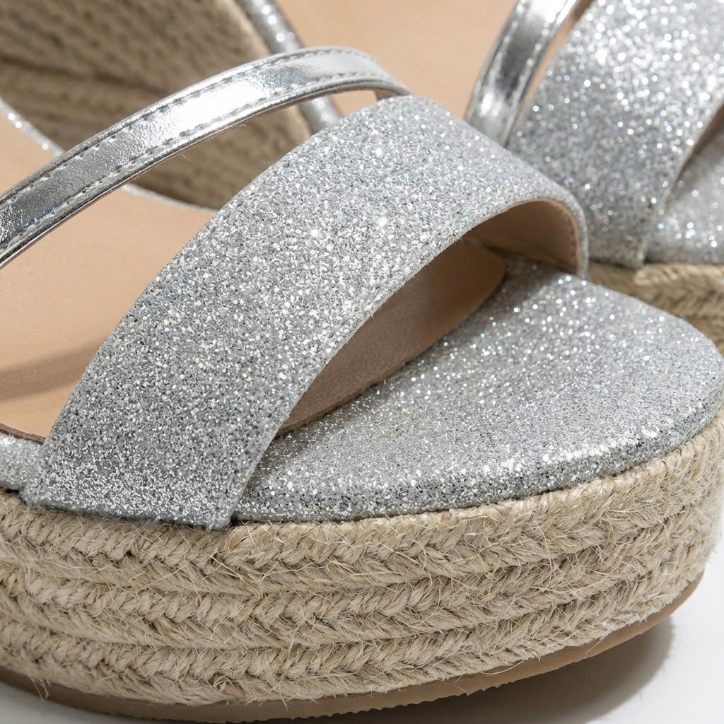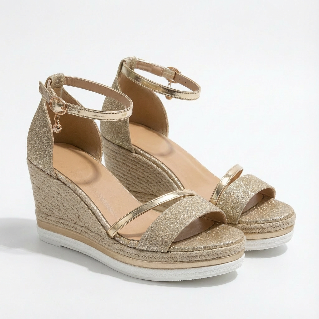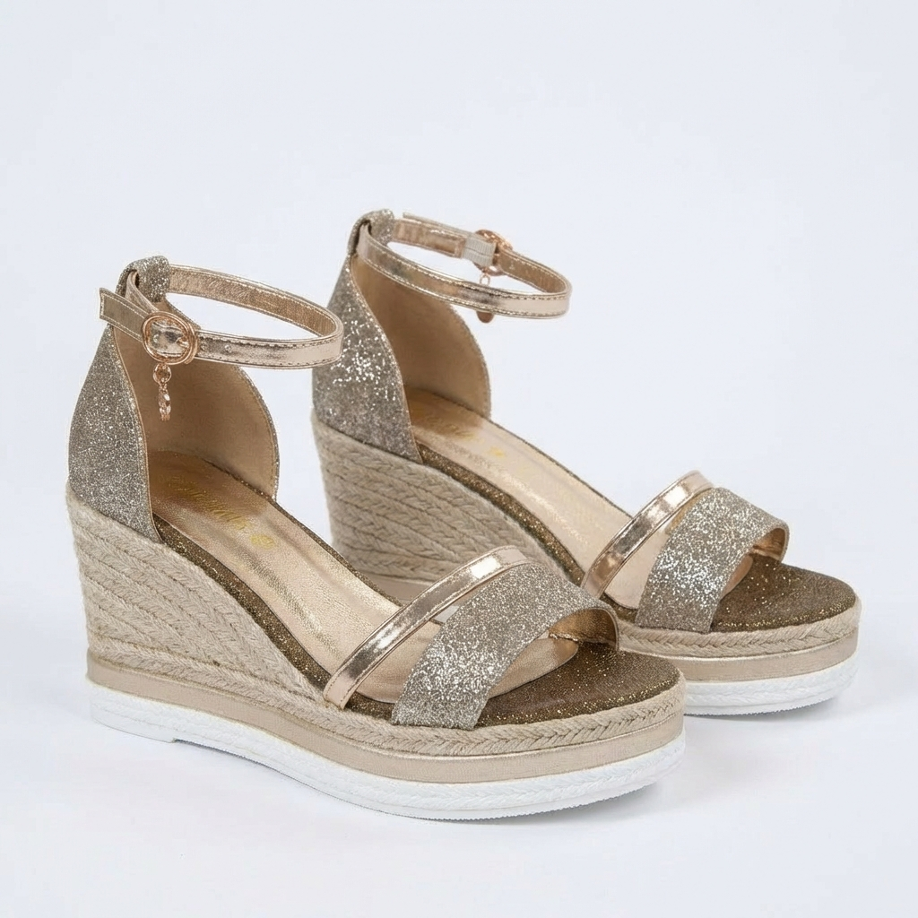 Brilla en cada paso con estas deslumbrantes sandalias cuña que fusionan elegancia festiva y comodidad veraniega en un diseño irresistiblemente glamuroso. El cautivador acabado brillante captura la luz creando destellos sutiles que elevan cualquier outfit de día o noche instantáneamente. La cuña estilo alpargata con trenzado artesanal proporciona altura favorecedora mientras garantiza estabilidad total. La correa de tobillo ajustable asegura sujeción personalizada y elegante, y la tira delantera con detalle decorativo enmarca tu pie con sofisticación. La plantilla acolchada abraza tu pie suavemente para confort duradero. Perfectas para bodas de verano, fiestas en terraza, cenas románticas, eventos especiales o cualquier celebración donde desees brillar con glamour femenino absoluto.