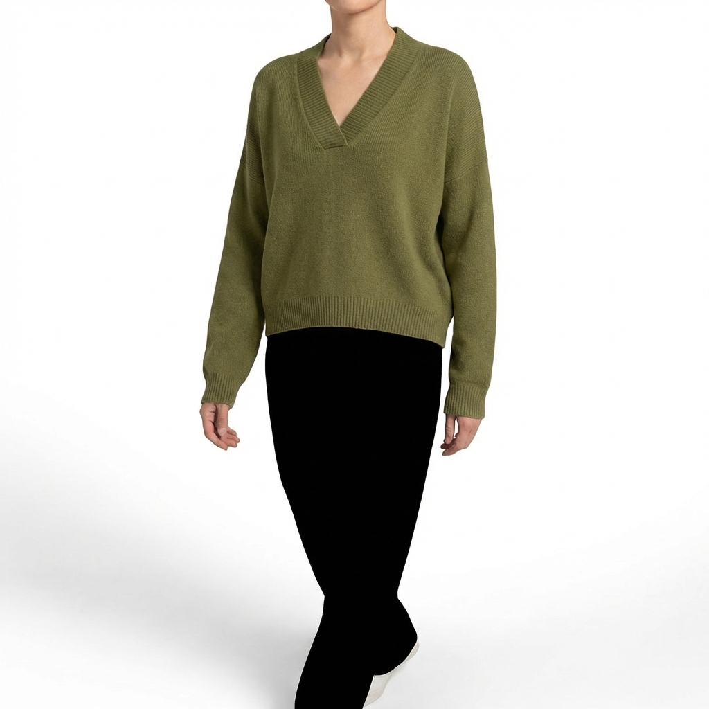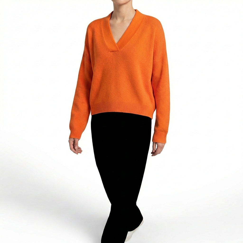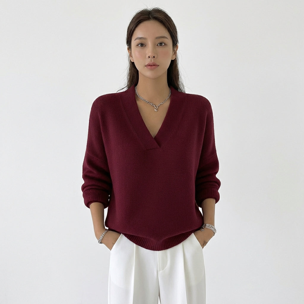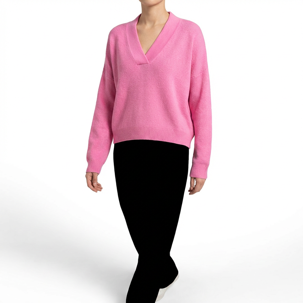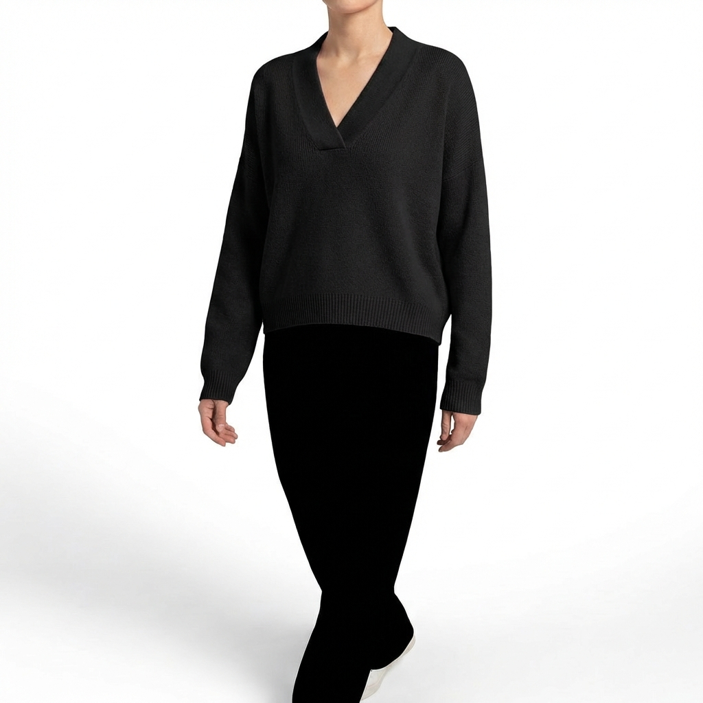 Calidez que abraza con elegancia. Un jersey con escote en V y corte holgado que convierte una prenda básica de invierno en tu pieza favorita de la temporada. La caída fluida envuelve el cuerpo sin ceñir, creando una silueta relajada pero sofisticada. El escote en V alarga el cuello y enmarca el rostro con un detalle favorecedor que lo distingue de cualquier jersey convencional. Las mangas amplias aportan volumen elegante que se estrecha hacia la muñeca con puño acanalado. Disponible en varios colores, combina a la perfección con pantalón de vestir para la oficina, vaqueros para el fin de semana o falda midi para una cena informal.