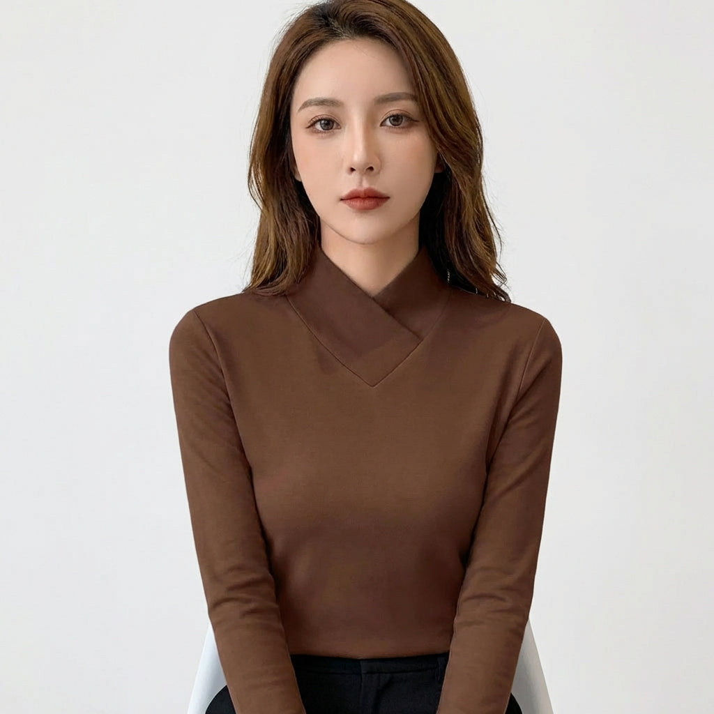 Destaca con un top de cuello alto cruzado que reinventa un básico de armario con un detalle arquitectónico sutil y moderno. Su cuello con solapa en V crea un efecto envolvente que enmarca el rostro con elegancia, combinando la protección de un cuello alto con la apertura favorecedora de un escote. El tejido elástico y suave se adapta al cuerpo como una segunda piel, definiendo la silueta con precisión sin oprimir ni incomodar. La manga larga mantiene los brazos cubiertos con calidez durante todo el día. Perfecto para capas bajo blazers, looks de oficina, citas o cualquier ocasión donde lo mínimo hable con fuerza.
