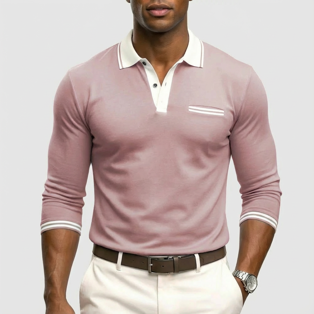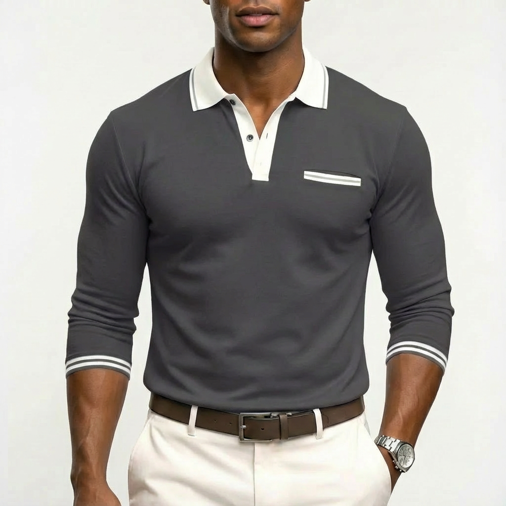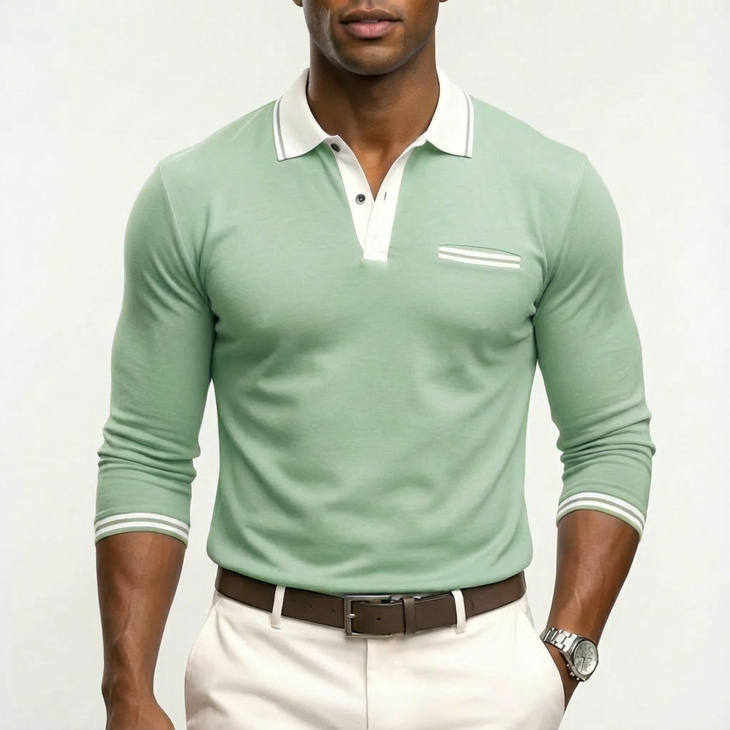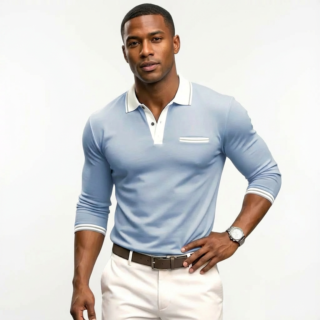 Proietta eleganza sportiva con questa polo che ridefinisce lo stile classico maschile. Il colletto a contrasto incornicia il volto con distinzione mentre i polsini con dettaglio a righe aggiungono un tocco raffinato che eleva l’insieme. La manica lunga offre versatilità per le mezze stagioni e le occasioni in cui serve un aspetto più curato. Il taglio aderente valorizza la figura senza limitare il movimento. Perfetta per partite di golf, incontri di lavoro informali, appuntamenti o qualsiasi occasione in cui desideri unire comodità e raffinatezza.