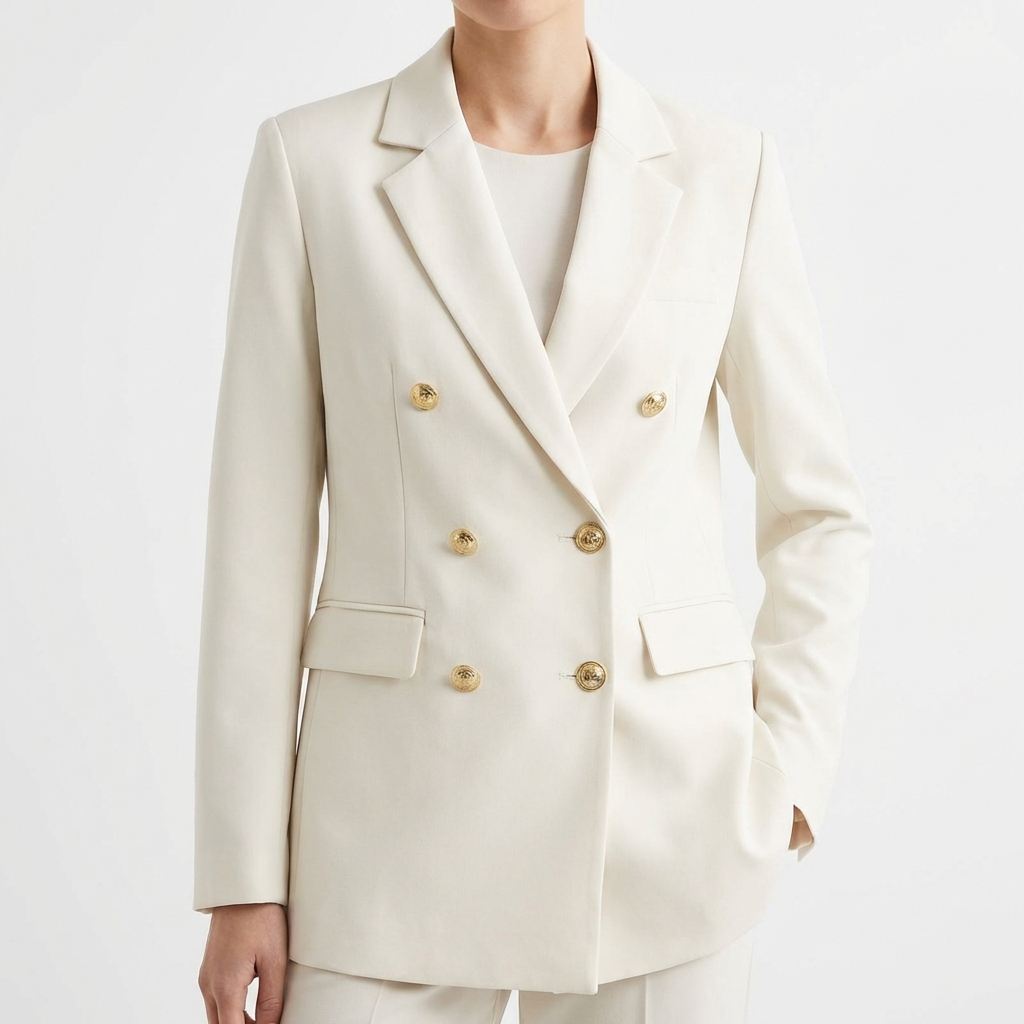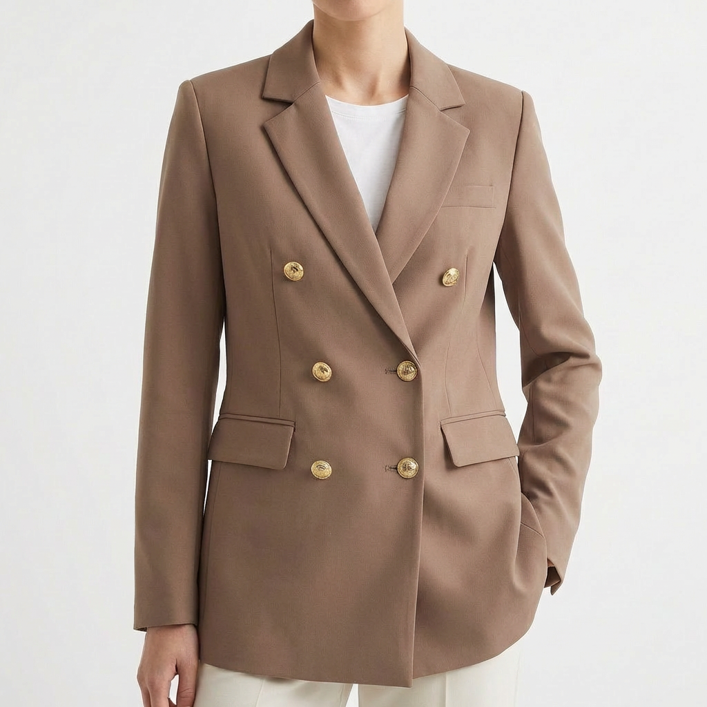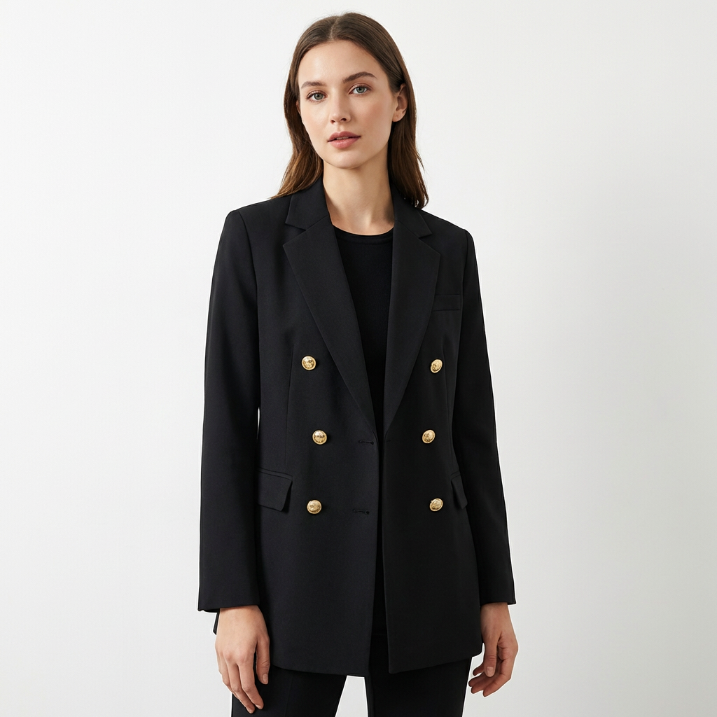 Domina ogni sala riunioni con un blazer che esprime potere femminile e raffinatezza professionale in ogni dettaglio. La sua chiusura incrociata definisce la vita creando una silhouette slanciata che trasmette autorità, mentre i bottoni decorativi aggiungono un tocco di eleganza raffinata. Il taglio strutturato valorizza le spalle proiettando sicurezza senza sacrificare il comfort per muoverti con naturalezza durante tutta la giornata. Perfetto per riunioni dirigenziali, presentazioni importanti o eventi aziendali in cui desideri lasciare un'impressione indimenticabile.