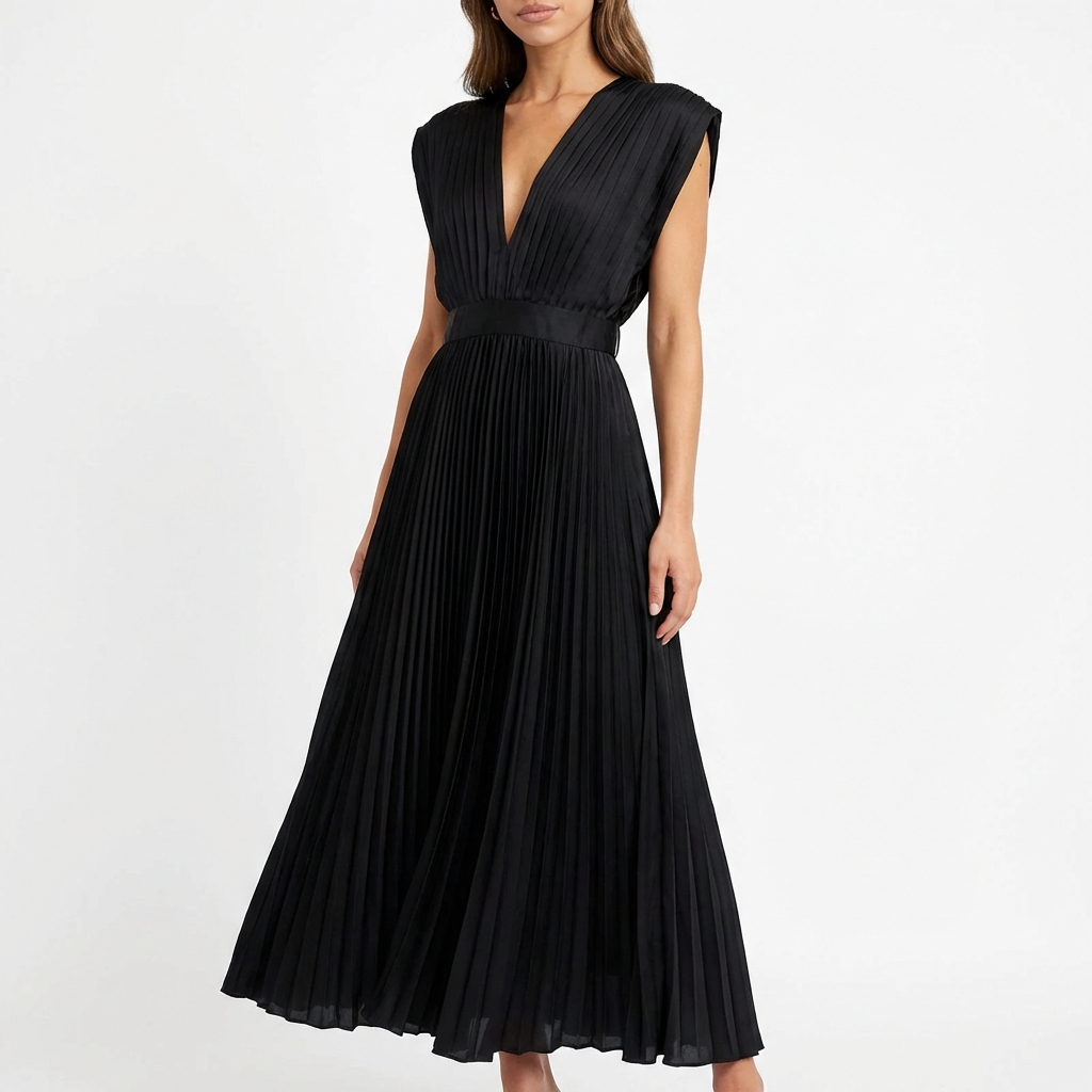 Scivola con eleganza in ogni movimento con questo sofisticato abito midi che trasforma la tua presenza con una trama ipnotica e una sagoma che valorizza. Il pregiato tessuto plissettato crea un effetto visivo di cascata fluente che cattura la luce a ogni passo aggiungendo profondità e un movimento romantico. Lo scollo a V profondo allunga visivamente la tua figura mentre incornicia il volto con raffinata eleganza. La vita definita esalta la tua forma naturale con grazia, e la gonna ampia scorre libera creando quell’effetto da sogno che rende memorabile ogni entrata. Le spalle allargate aggiungono una struttura sofisticata. Perfetto per matrimoni diurni, battesimi, comunioni, cene eleganti, lauree o qualsiasi celebrazione in cui desideri emanare una sofisticatezza senza tempo.