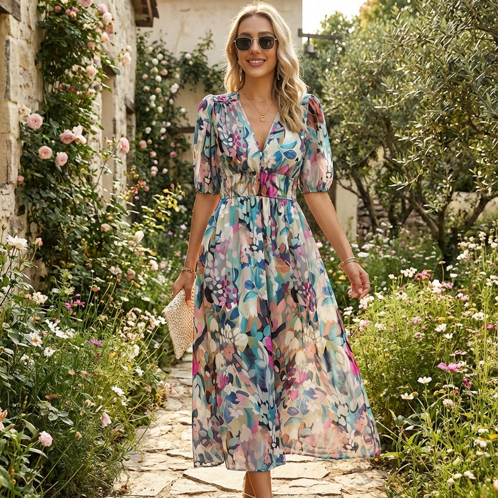 Emily | Vestito Midi da Donna con Scollo a V e Stampa Floreale