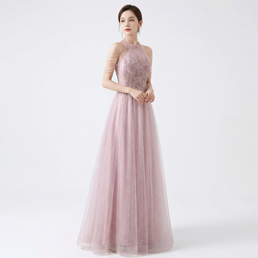 Lucia | Abito da festa rosa da donna con pizzo floreale e tulle lucente | Elegante