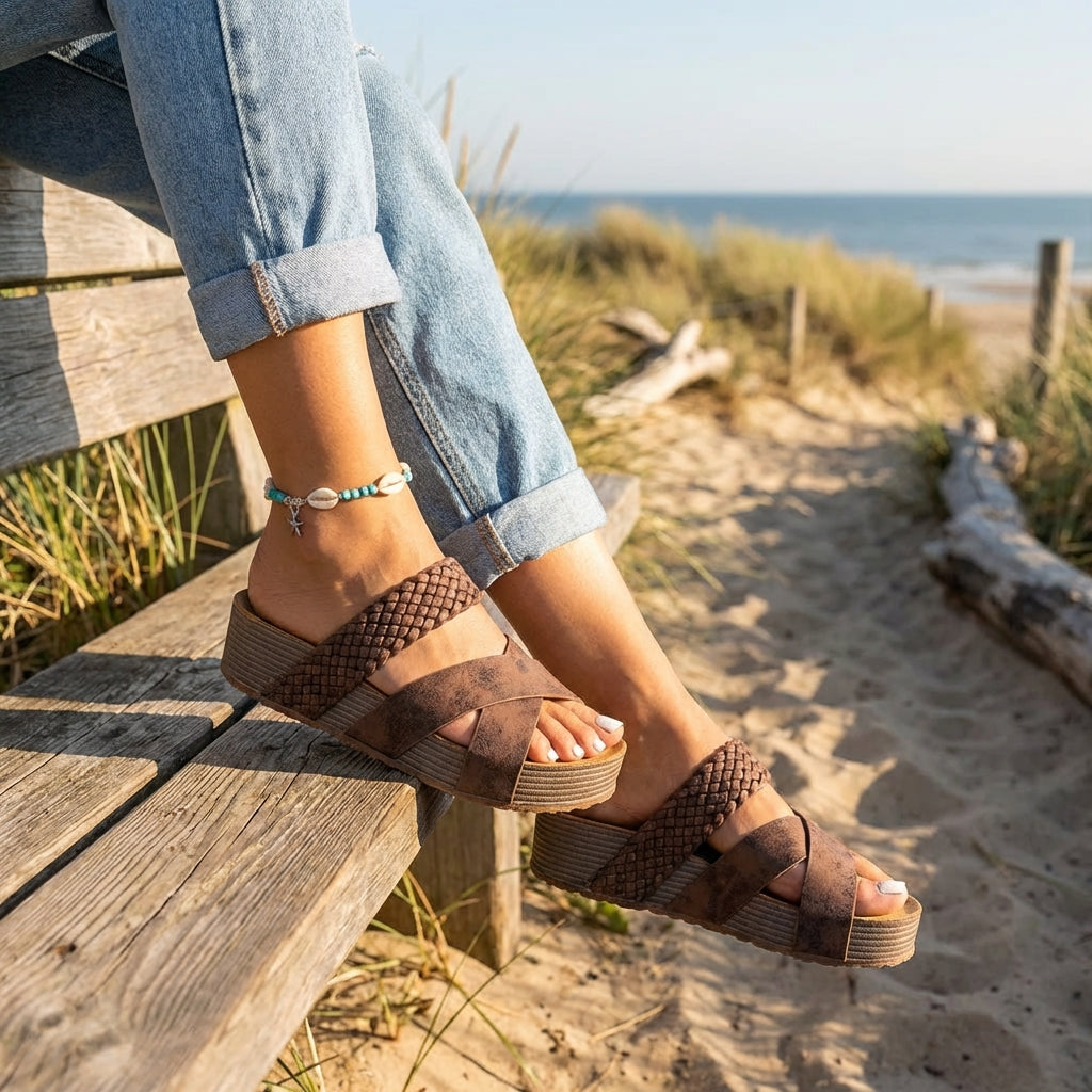 Cammina con sicurezza e stile estivo con un paio di sandali con zeppa che combinano cinturini incrociati con dettagli intrecciati per un look artigianale ricco di carattere. La loro zeppa leggera aggiunge altezza senza sacrificare la stabilità, permettendoti di camminare con fiducia per ore su qualsiasi superficie. I cinturini larghi avvolgono il piede con fermezza e comfort, distribuendo il peso in modo equilibrato mentre il design aperto mantiene i piedi freschi e ventilati. La finitura invecchiata dona un’aria bohemien e vissuta. Perfetti per mercatini, passeggiate nel centro storico, chiringuitos o pomeriggi in terrazza.