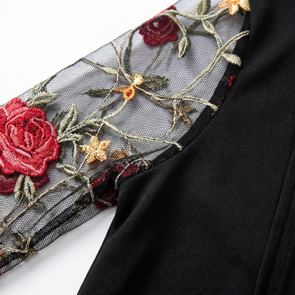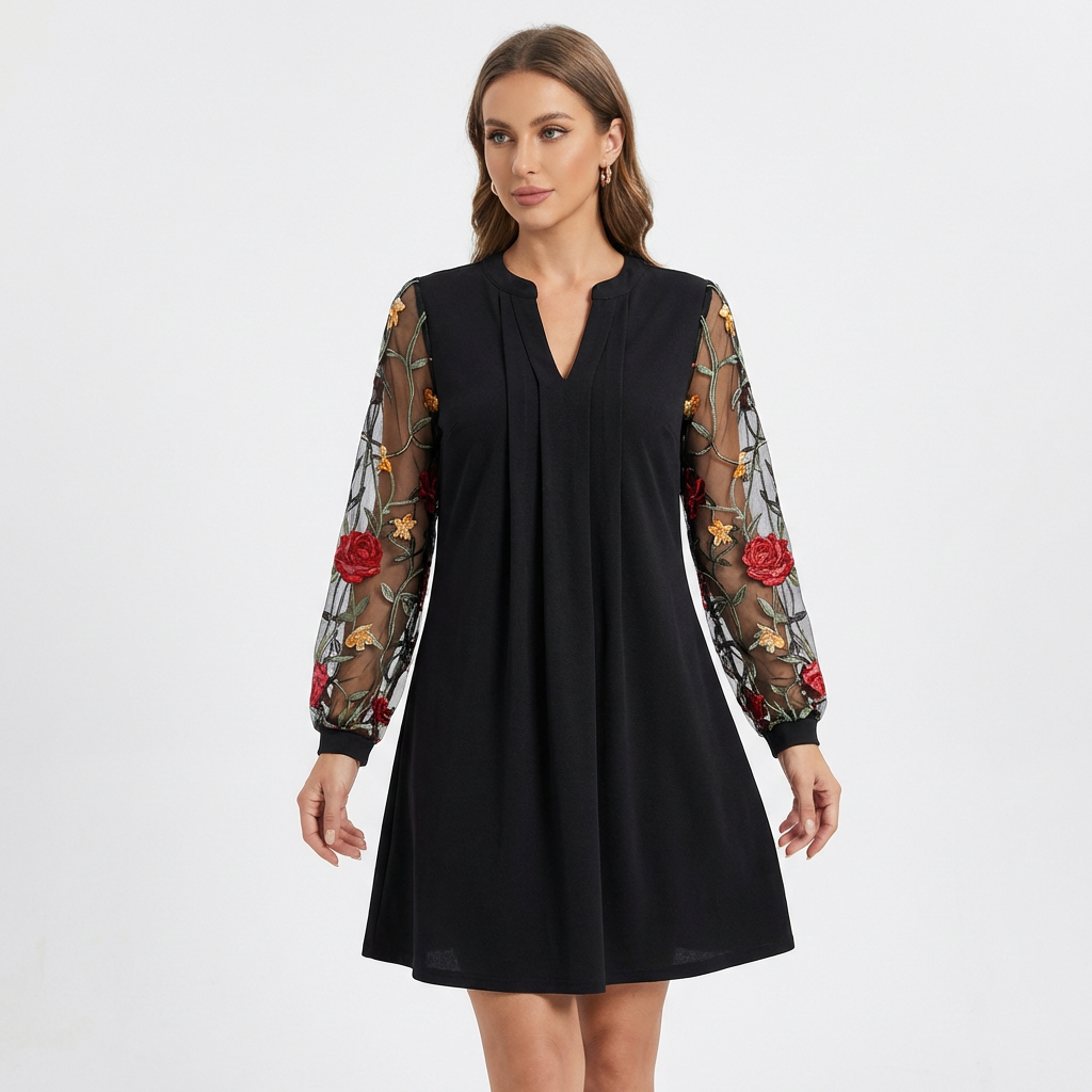 Eleganza che lascia il segno. Questo vestito con maniche trasparenti ricamate con motivi floreali è il capo che trasforma ogni occasione in un momento speciale. Il corpo in tonalità scura dona sofisticatezza e slancia la silhouette, mentre le maniche trasparenti con fiori ricamati a colori vivaci creano un contrasto abbagliante che cattura tutti gli sguardi. Lo scollo a V allunga il collo con femminilità, e la caduta ampia a trapezio offre comfort e movimento senza perdere eleganza. Perfetto per cene romantiche, celebrazioni, cocktail o qualsiasi evento in cui desideri brillare con un tocco di arte e femminilità.