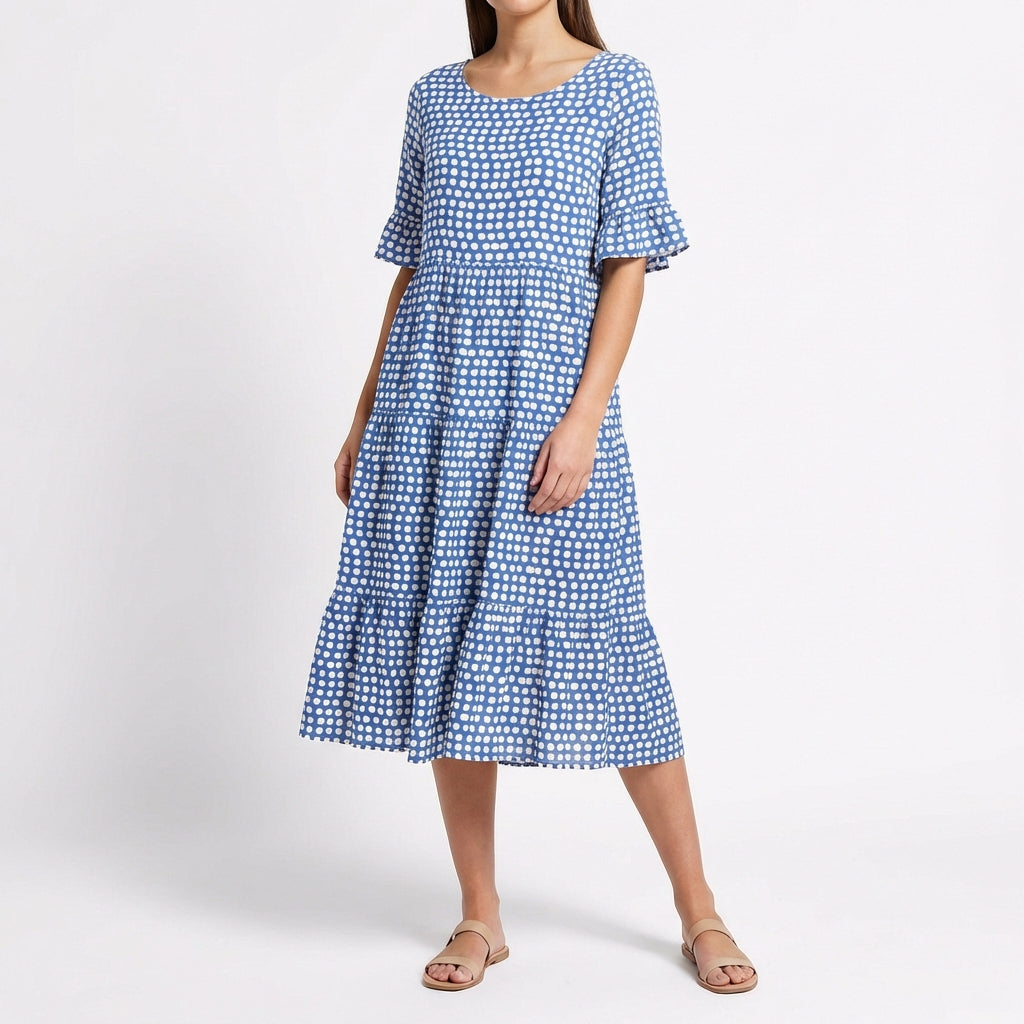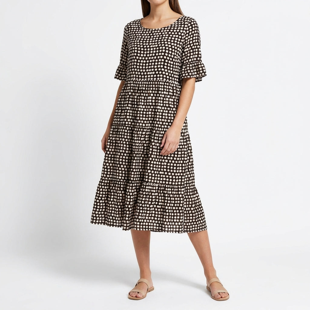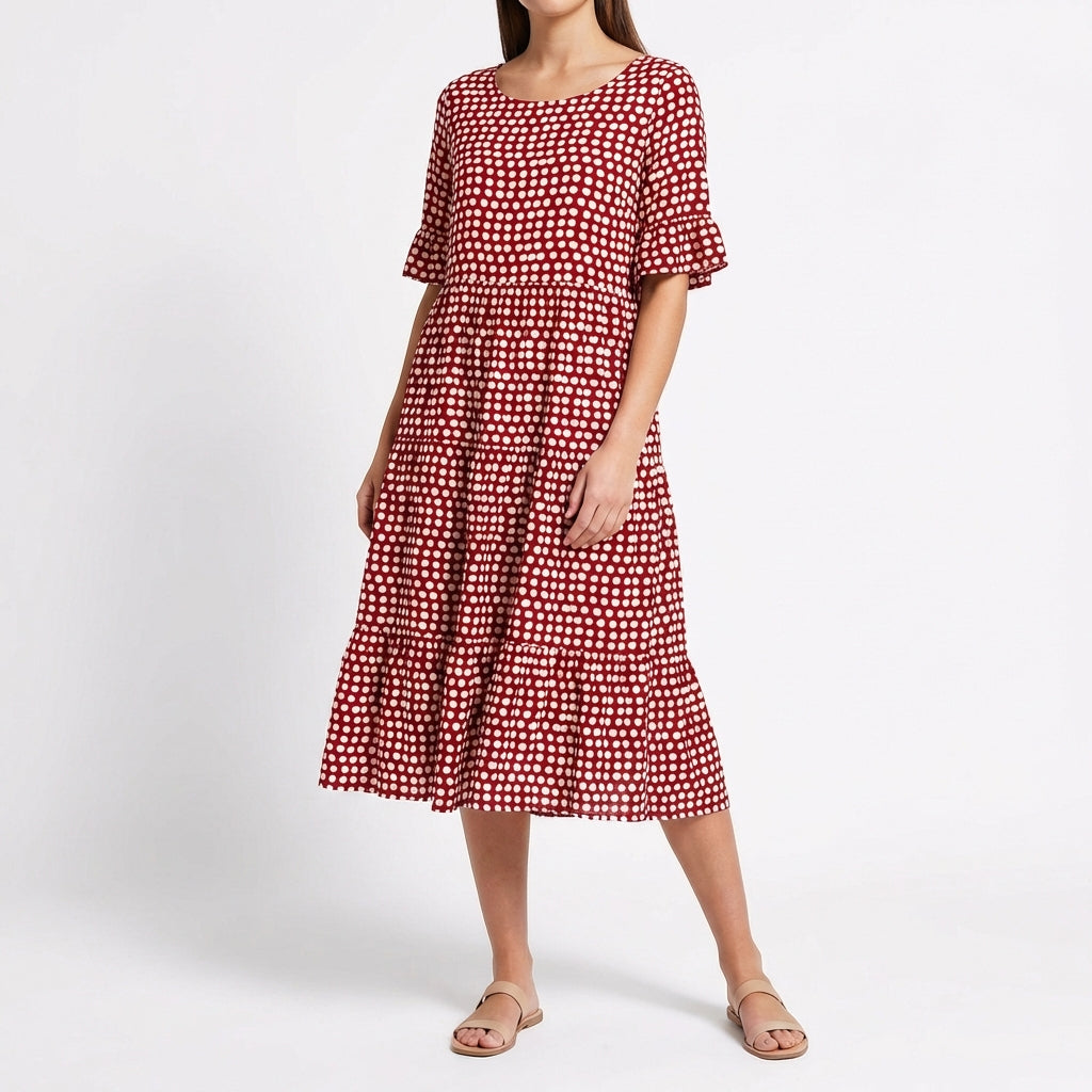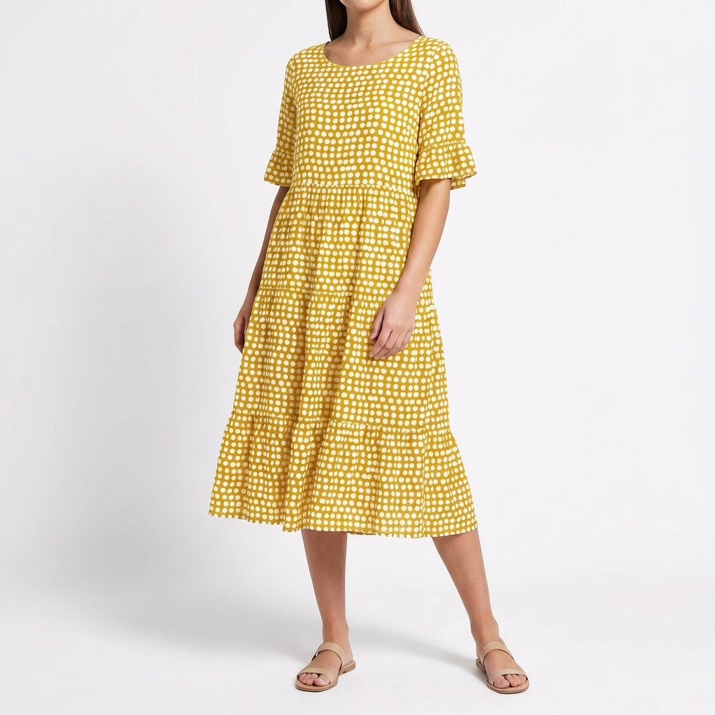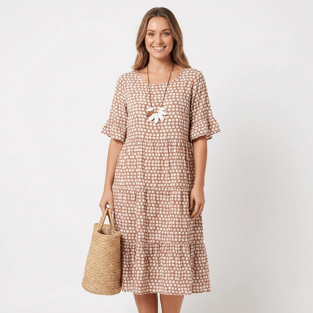 Goditi il bel tempo con un vestito midi a balze che combina dolcezza, freschezza e movimento in un capo irresistibilmente comodo. La sua linea ampia con pannelli arricciati crea un effetto svolazzante incantevole che si muove con grazia a ogni passo, valorizzando ogni silhouette senza stringere. Le maniche con volant aggiungono un dettaglio romantico che eleva il casual a speciale senza sforzo. La stampa a pois artigianale dona un fascino unico e spensierato. Perfetto per mercatini, appuntamenti all’aperto, passeggiate in paese o brunch in cui vuoi sentirti radiosa.