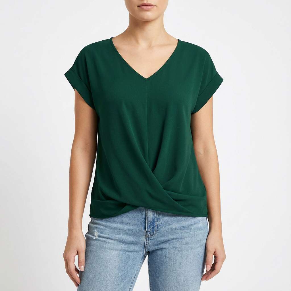 Scopri la combinazione perfetta di comfort e stile con la nostra T-shirt da Donna con Scollo a V e Dettaglio Anteriore Intrecciato. Questa maglietta chic presenta un lusinghiero scollo a V e un moderno dettaglio intrecciato nella parte frontale che la distingue dalle comuni t-shirt. Le maniche corte e il taglio regolare assicurano che tu rimanga fresca e comoda tutto il giorno, rendendola un'opzione ideale per uscite informali o per un outfit da ufficio rilassato.