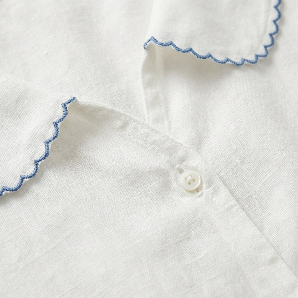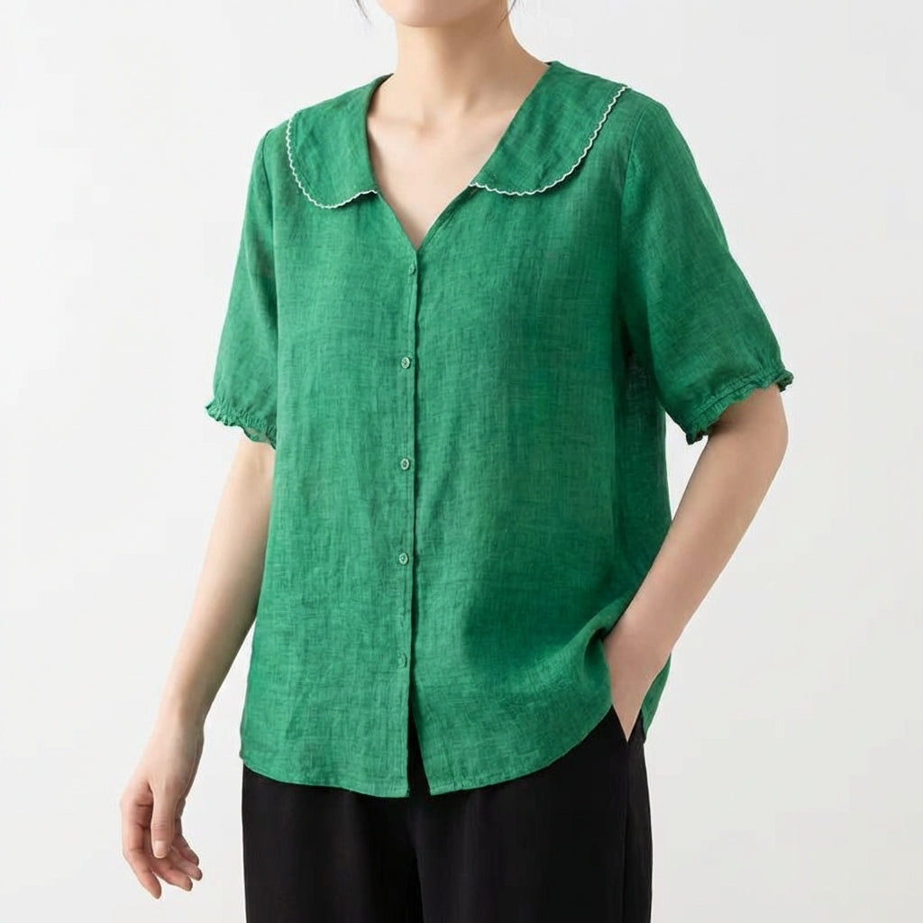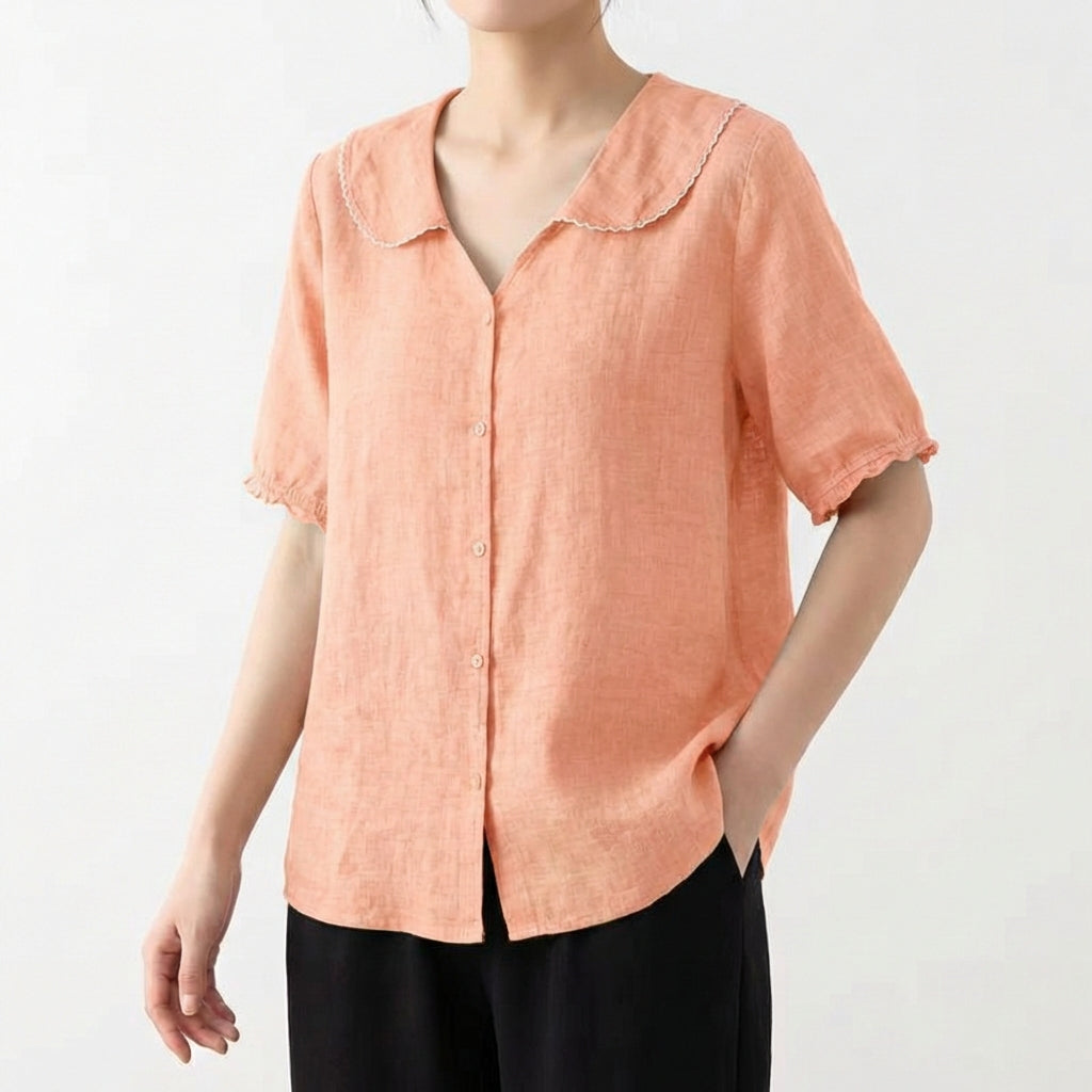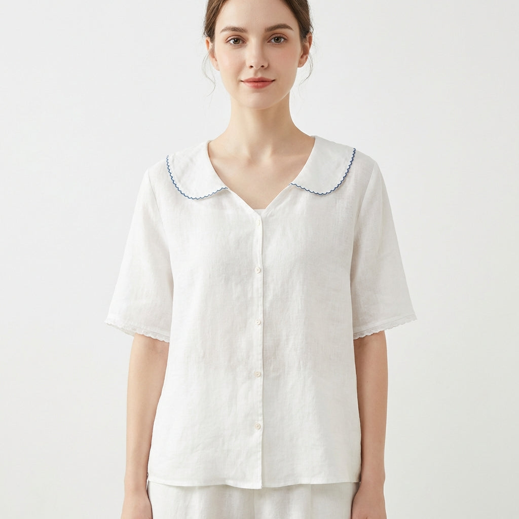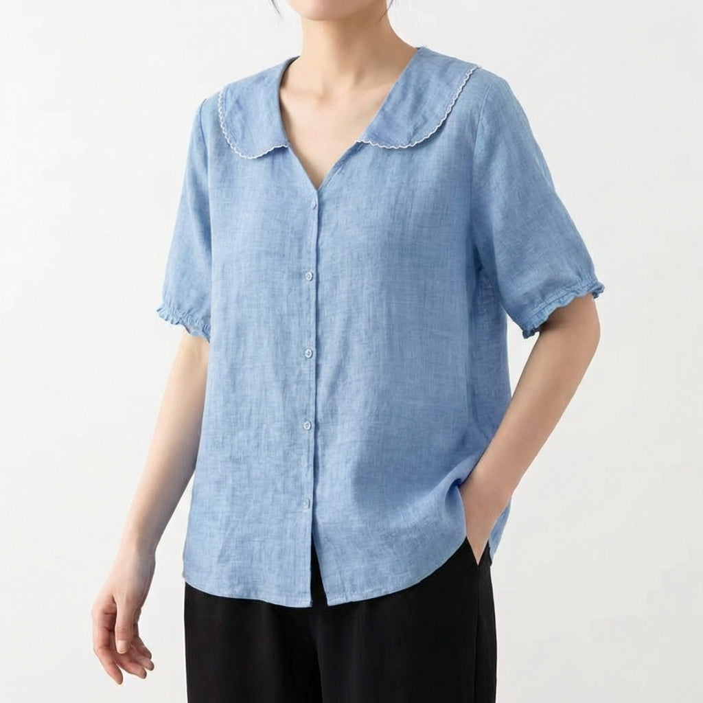 Dolcezza e freschezza in un solo capo. Questa camicetta a maniche corte con collo alla Peter Pan bordato si distingue per il suo aspetto romantico e delicato che richiama uno stile cottage incantevole. Il suo taglio ampio e vaporoso permette una ventilazione naturale, mentre la chiusura frontale con bottoni aggiunge un dettaglio classico e funzionale. Le maniche con un leggero volant donano femminilità senza appesantire. Perfetta per look primaverili ed estivi, abbinala a gonne midi, jeans o pantaloni a vita alta per un risultato fresco e femminile.