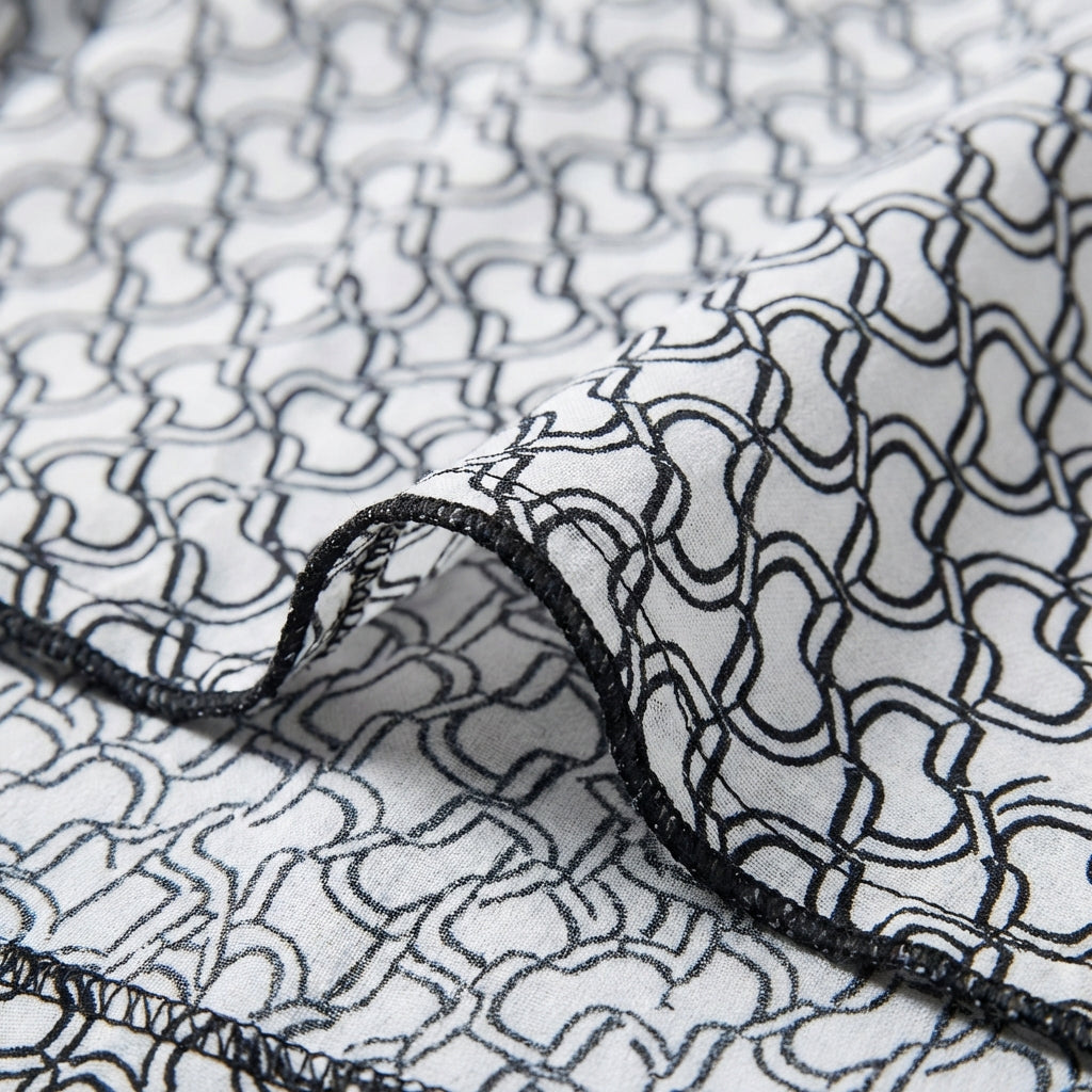 - Stampa geometrica integrale: Motivi ripetitivi che coprono l’intero capo con un ritmo visivo dinamico, conferendo personalità senza bisogno di accessori aggiuntivi.