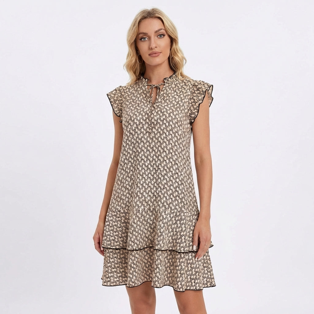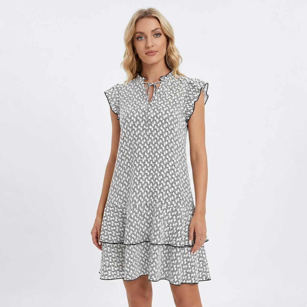 Sprigiona freschezza e fascino con un vestito corto a volant che cattura l’essenza dell’estate mediterranea in ogni dettaglio. La sua linea morbida tipo babydoll scende fluida dalle spalle, offrendo totale libertà di movimento e un comfort che ti farà desiderare di indossarlo ogni giorno. Le maniche a farfalla con volant incorniciano le braccia con un battito delicato e femminile, mentre il doppio volant sull’orlo dona movimento e dinamismo al camminare. Perfetto per gelati in riva al mare, appuntamenti estivi, passeggiate al tramonto o qualsiasi occasione in cui vuoi apparire allegra e spensierata.