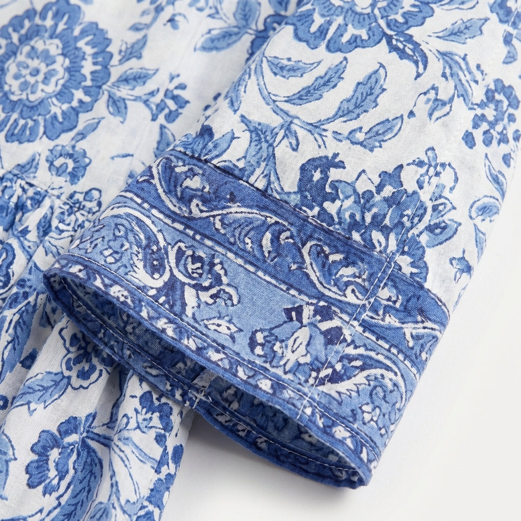 - Stampa floreale artigianale con bordura: Motivi botanici dettagliati con fascia decorativa sul fondo che aggiunge ricchezza visiva e una finitura di ispirazione artigianale.