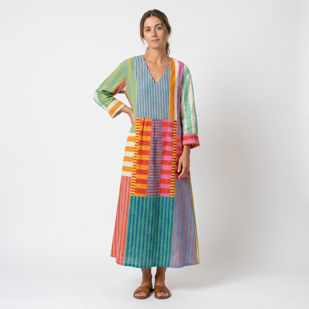 Indossati come una tela vivente con un abito lungo patchwork che esplode di colore e allegria attraverso pannelli di righe in tutte le direzioni e tonalità immaginabili. Il suo taglio ampio e fluido avvolge il corpo con una libertà totale che sembra non indossare nulla, mentre la vibrante combinazione di blocchi orizzontali e verticali crea un effetto artistico che trasforma ogni passo in una celebrazione visiva. La scollatura a V allunga il collo in modo naturale e la manica lunga arrotolabile si adatta al clima. Perfetto per mercatini, vacanze, festival o qualsiasi giorno in cui il tuo umore richieda colore senza limiti.