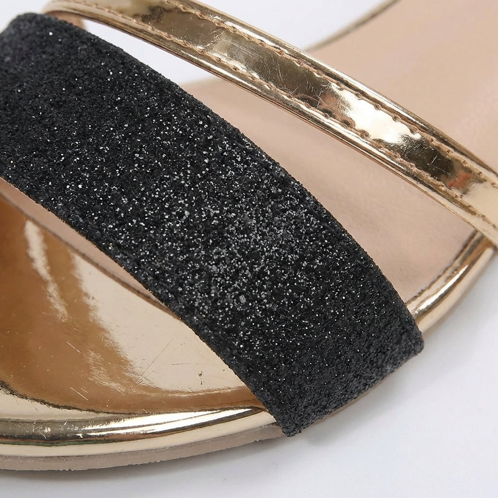 Scintille a ogni passo senza rinunciare al comfort. Un paio di sandali con tacco basso, finitura lucida e cinturino alla caviglia che donano il tocco di glamour perfetto per chi cerca eleganza senza il disagio di un tacco alto. Le fasce con texture glitterata e bordo metallico catturano la luce a ogni movimento, creando un effetto gioiello sottile ma irresistibile. Il tacco basso con dettagli geometrici aggiunge sofisticazione da ogni angolazione. La fibbia con ciondolo decorativo alla caviglia aggiunge un dettaglio delicato che completa il design. Ideali per matrimoni, comunioni, cene eleganti o qualsiasi celebrazione in cui vuoi brillare comodamente per tutta la notte.