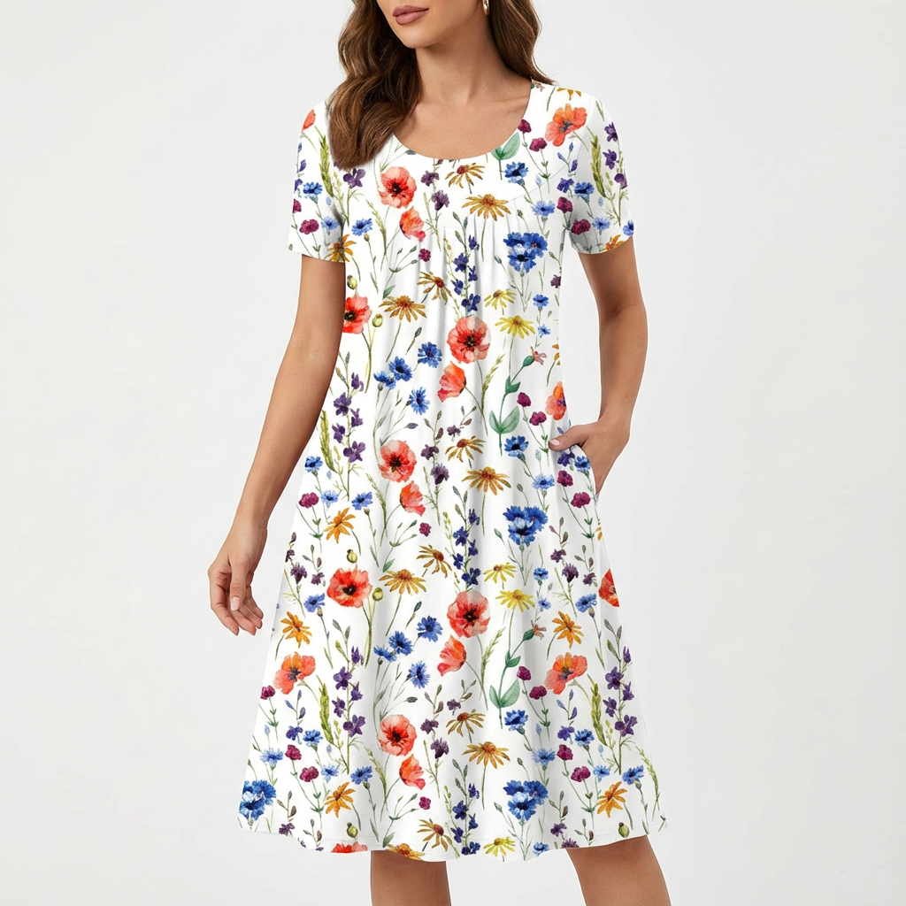 Immergiti nell'eleganza con il nostro Vestito Midi Floreale a Taglio A da Donna, progettato per chi apprezza lo stile senza rinunciare al comfort. Il bellissimo motivo floreale aggiunge un tocco di romanticismo, rendendolo perfetto per diverse occasioni, dalle uscite casual agli eventi più raffinati. La sua silhouette favorevole a taglio A valorizza ogni figura, mentre le pieghe aggiunte e le tasche funzionali ne elevano sia l'estetica che la praticità.