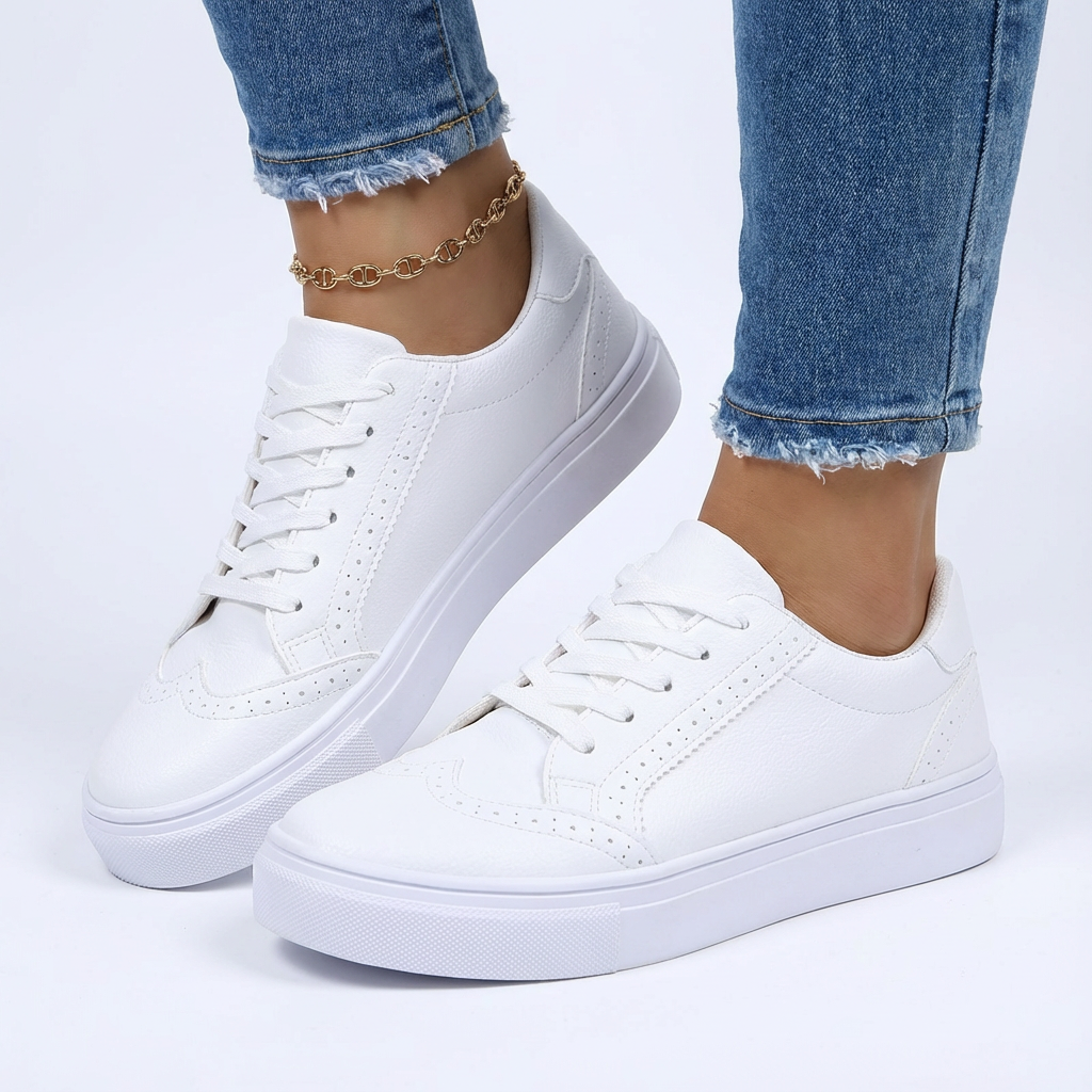 Queste scarpe da ginnastica con plateau e lacci da donna combinano un design contemporaneo con i dettagli classici wingtip, offrendo un look raffinato per ogni occasione casual. La silhouette a taglio basso si abbina perfettamente a una varietà di outfit, rendendole un'ottima scelta sia per commissioni che per uscite rilassate. Progettate per il comfort e il supporto, queste scarpe assicurano che i tuoi piedi rimangano felici tutto il giorno.