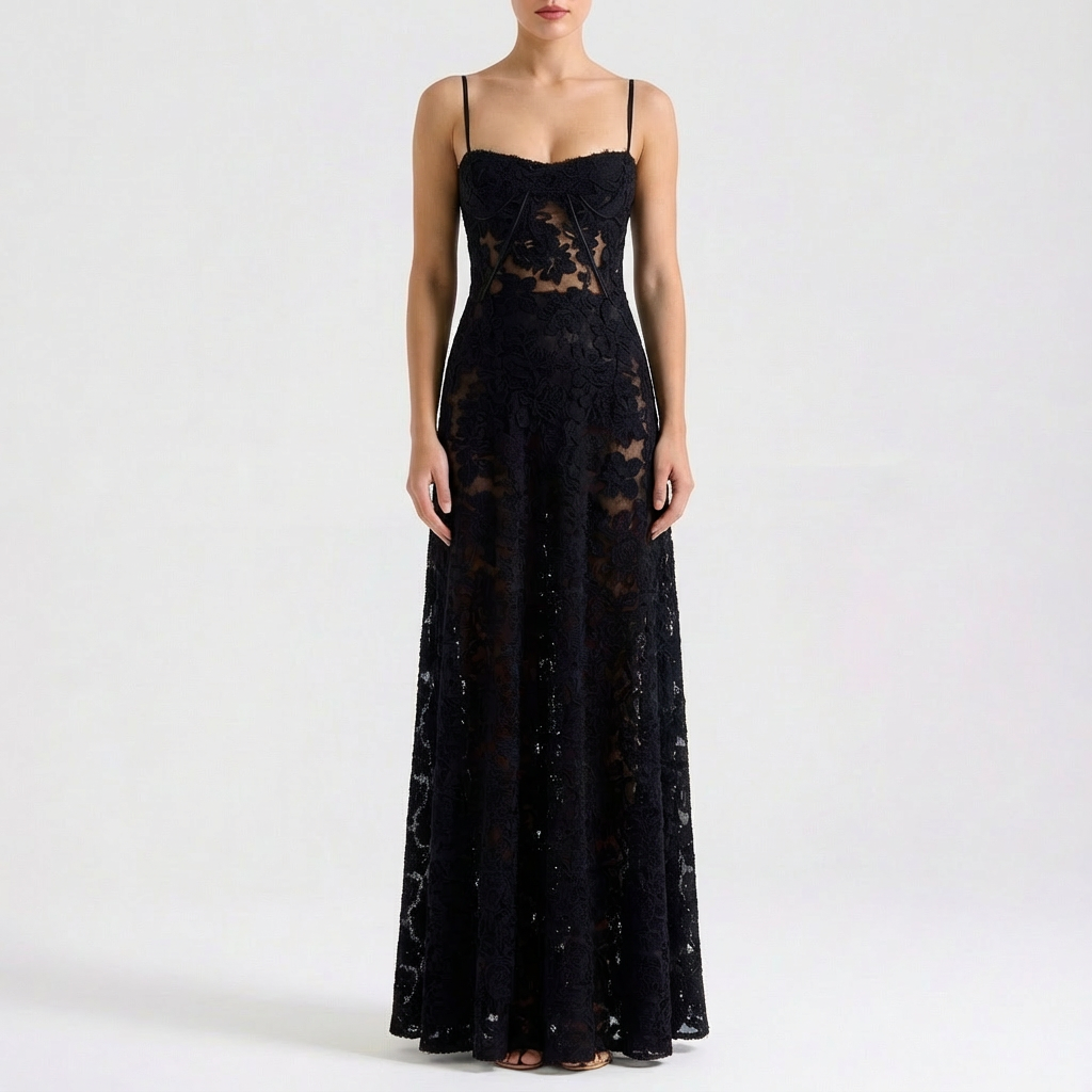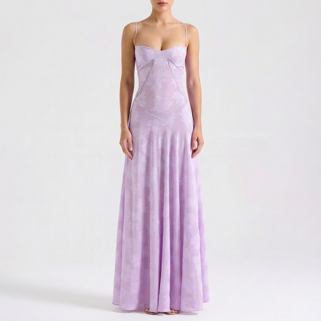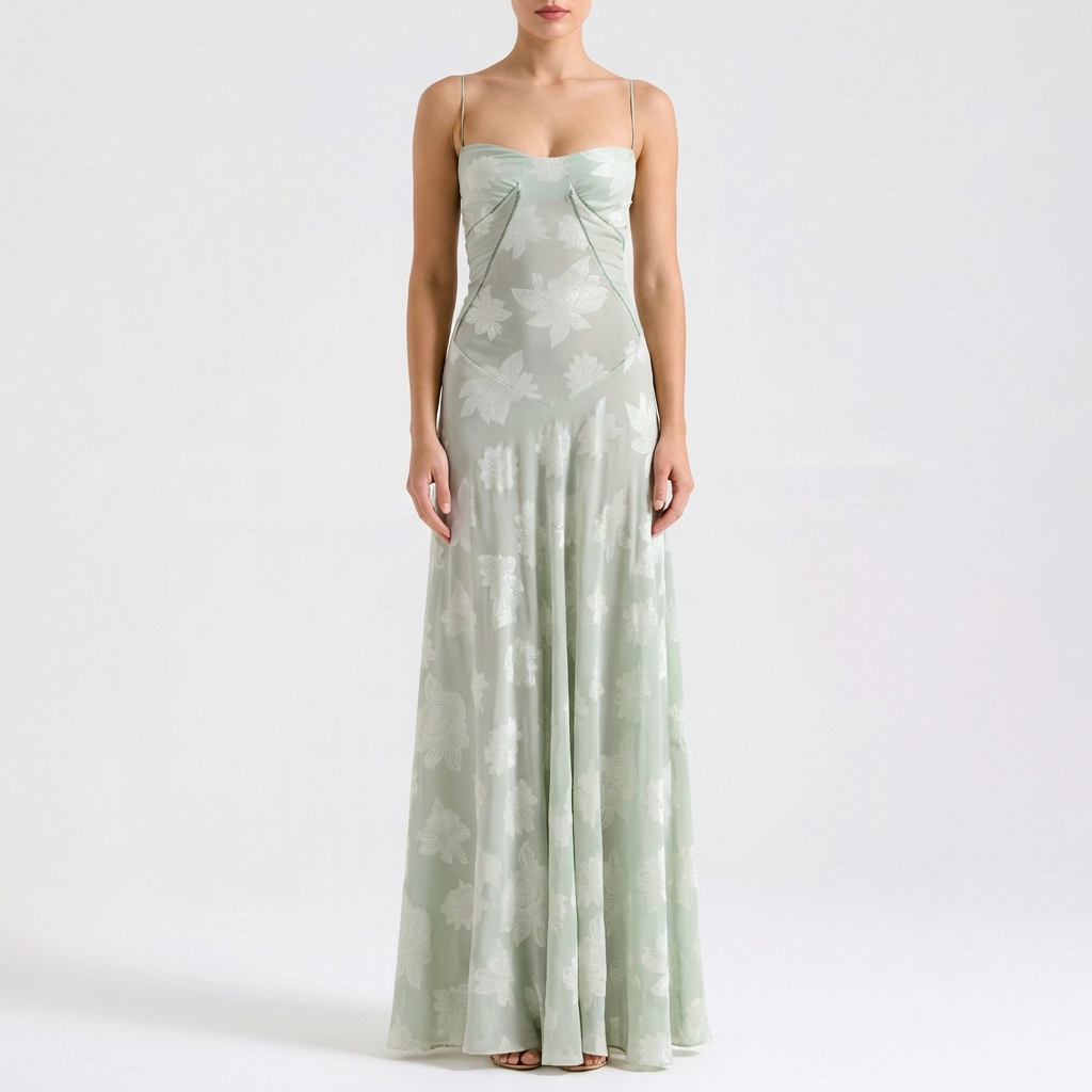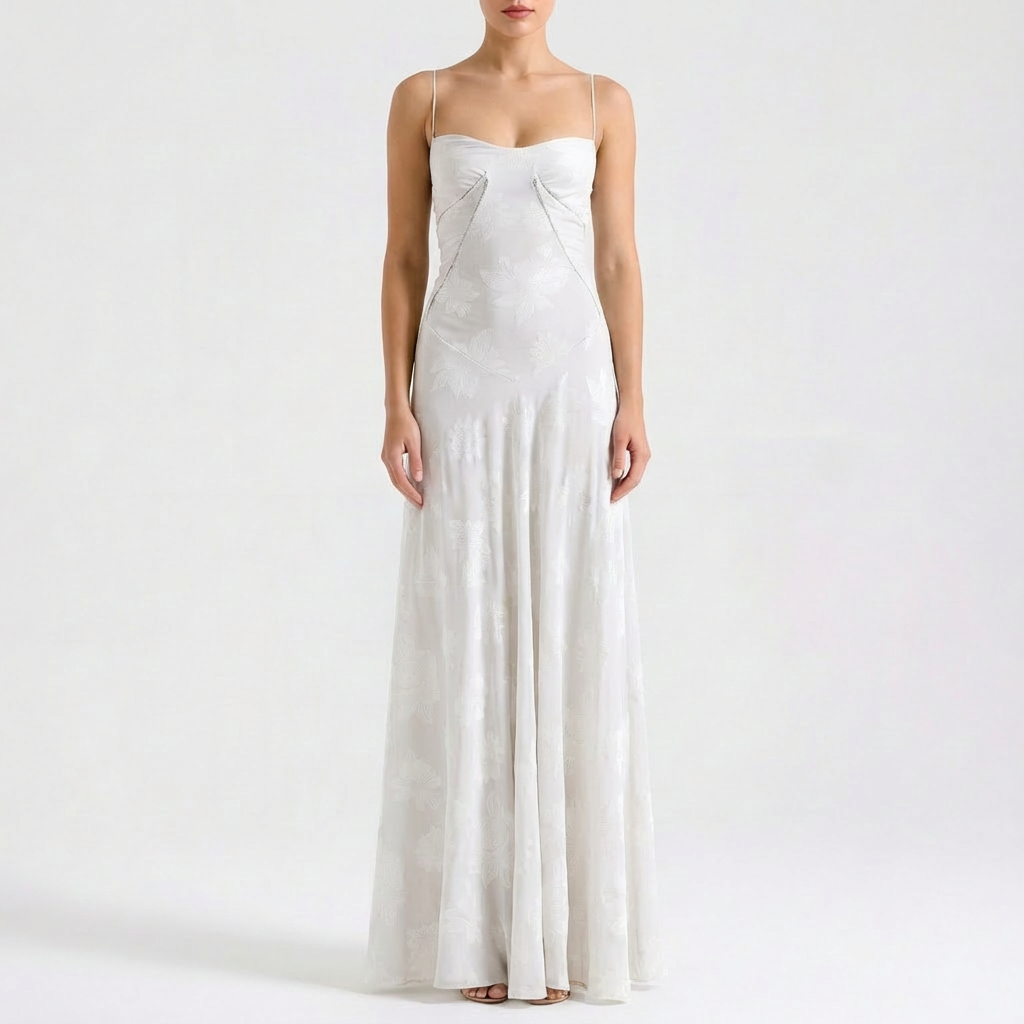 Incanta con la tua presenza in questo squisito abito lungo che cattura l’essenza del romanticismo e dell’eleganza senza tempo. Il delicato ricamo floreale in rilievo crea un effetto tridimensionale sofisticato che aggiunge una texture artistica e una femminilità raffinata a ogni movimento. Le spalline sottili slanciano delicatamente le spalle mentre la silhouette fluida fino a terra valorizza la tua figura con grazia naturale. La base trasparente con motivi ricamati dona un tocco etereo senza perdere la raffinatezza. Perfetto per matrimoni primaverili, cerimonie all’aperto, eventi in giardino, feste eleganti o qualsiasi celebrazione speciale in cui desideri apparire romantica e sofisticata con assoluta delicatezza.