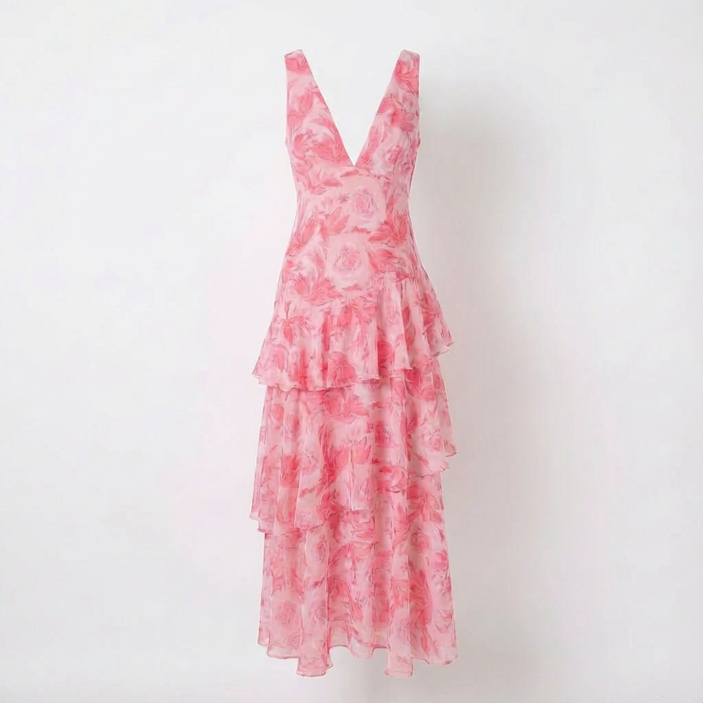 Indossa una silhouette affascinante e femminile con il nostro abito maxi con volant, una delizia visiva che presenta una splendida stampa floreale. Questo abito sfoggia una scollatura a V favorevole e una schiena aperta e divertente che crea un perfetto equilibrio tra eleganza e comfort. Ideale per uscite estive, matrimoni o una serata romantica, il suo design a strati permette un movimento elegante ad ogni passo che fai.