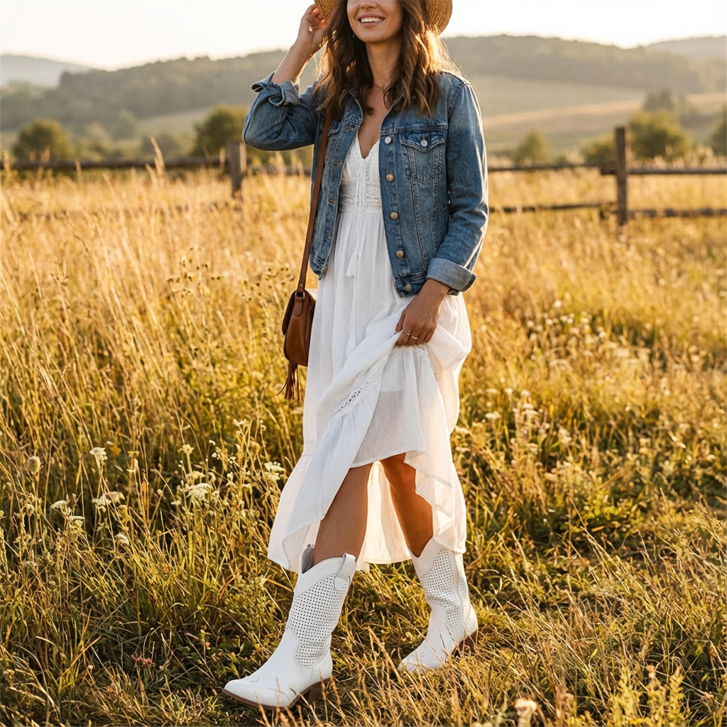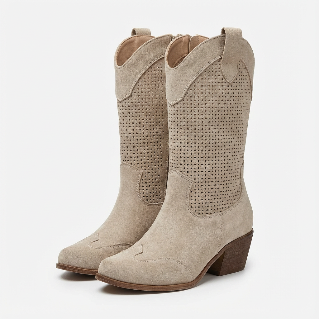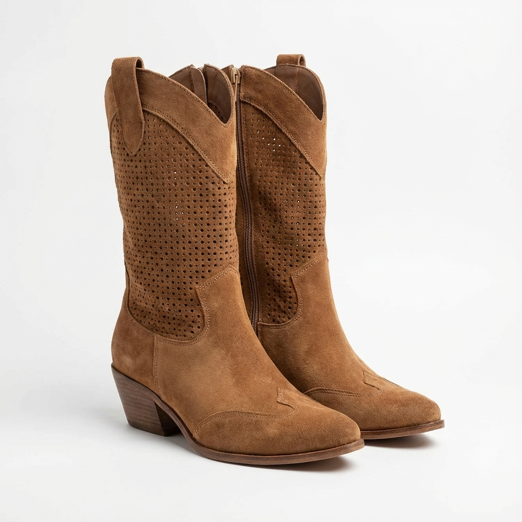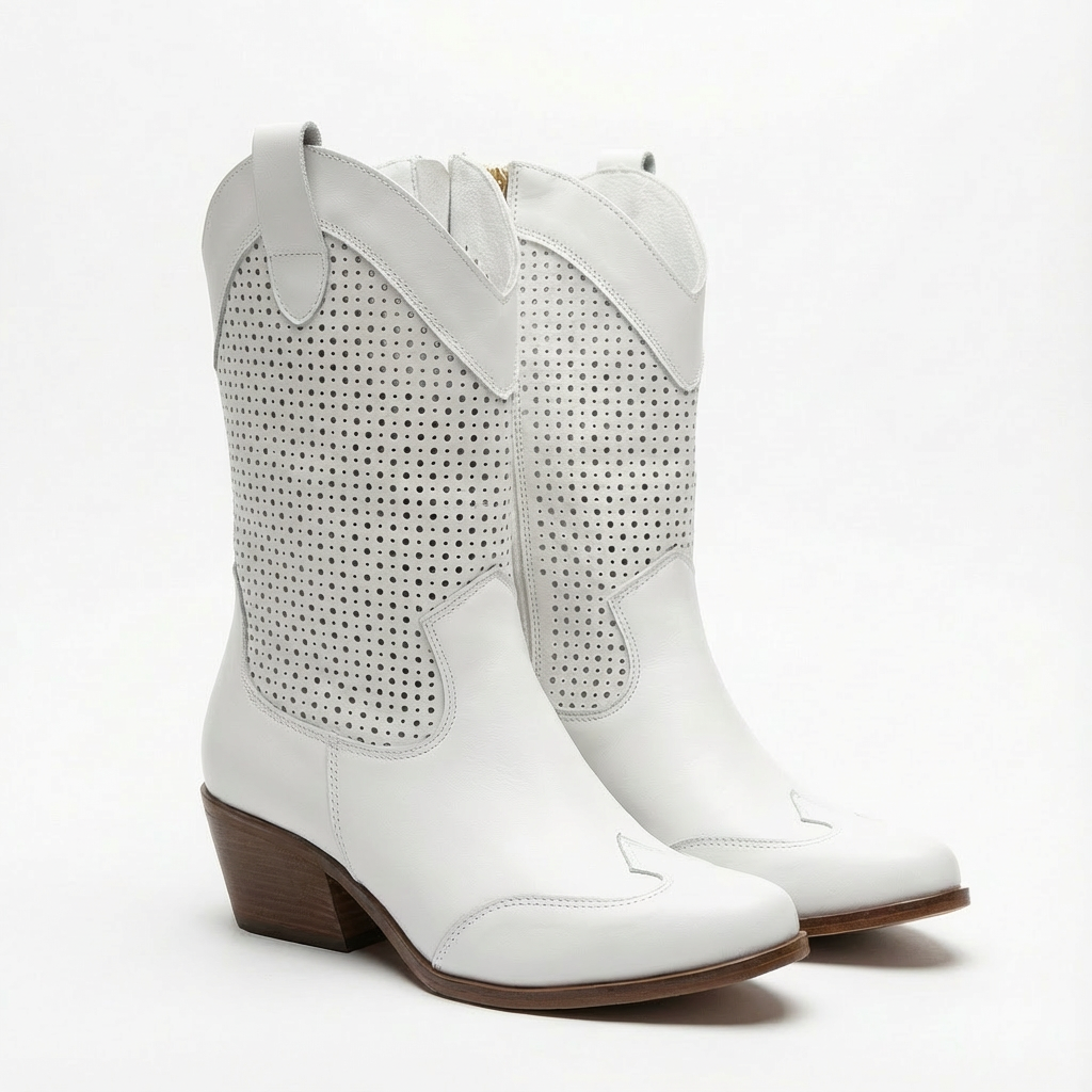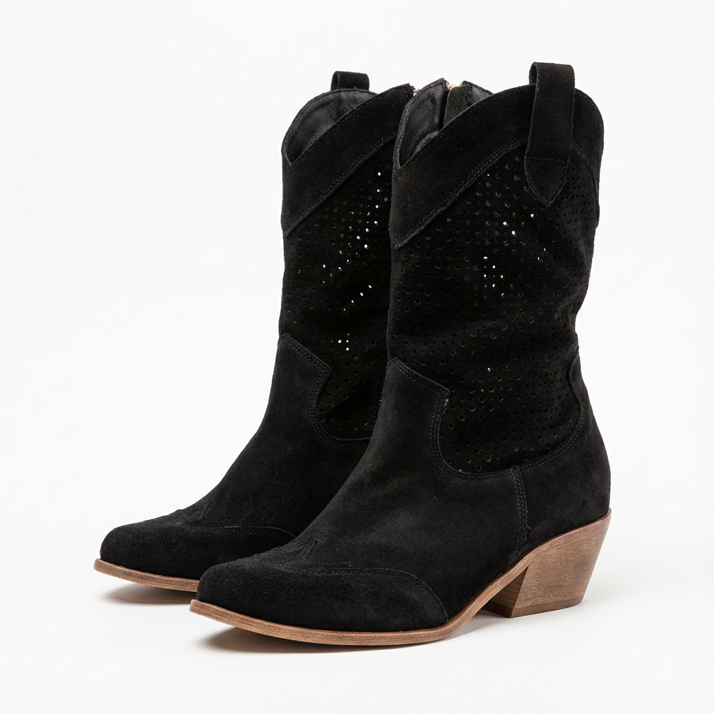 Valorizza il tuo outfit con i nostri stivaletti in stile cowboy, caratterizzati da un design forato unico e un tacco largo e robusto per maggiore comfort e stile. Combinando perfettamente lo stile western con le tendenze moderne, questi stivaletti sono un complemento essenziale per il tuo guardaroba. Progettati per facilitare l'uso, offrono una linguetta funzionale che garantisce una calzata senza complicazioni. Distinguiti in ogni ambiente con questa versatile opzione di calzature.