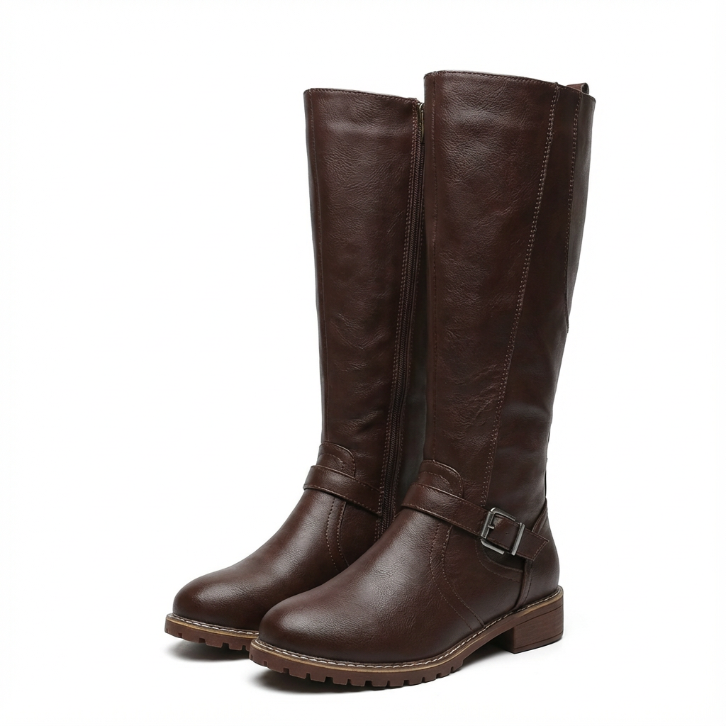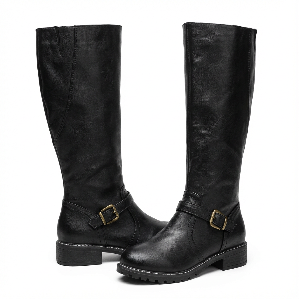 Questi stivali alti da equitazione fino al ginocchio per donna combinano il fascino classico con un tocco moderno. Con un elegante tacco quadrato e un vistoso dettaglio con fibbia, offrono eleganza e comfort per l'uso quotidiano. Il design con punta arrotondata aggiunge un tocco di sofisticazione che si abbina perfettamente a qualsiasi outfit. Perfetti per distinguerti in ogni occasione.